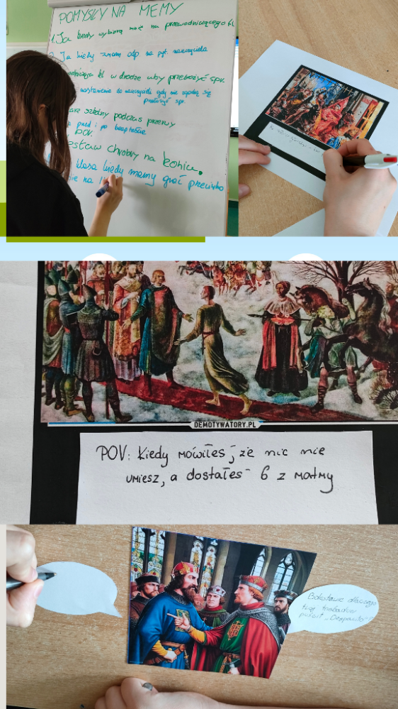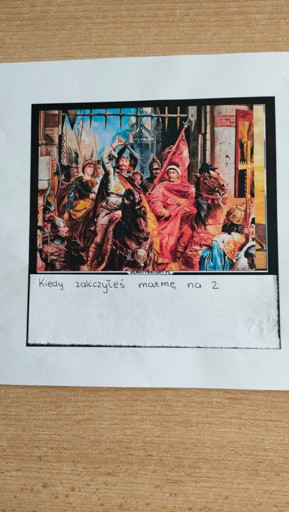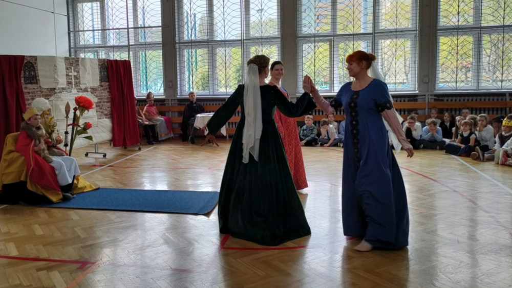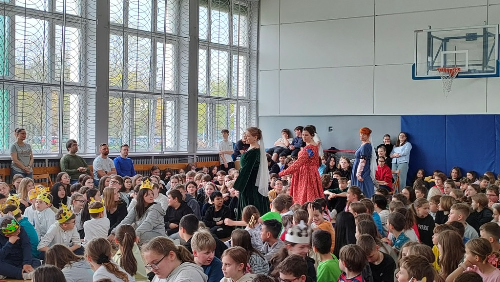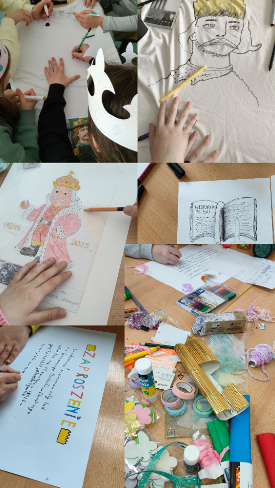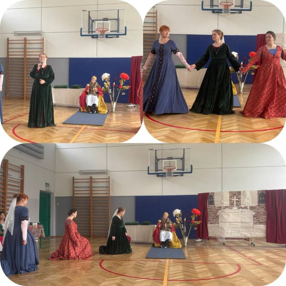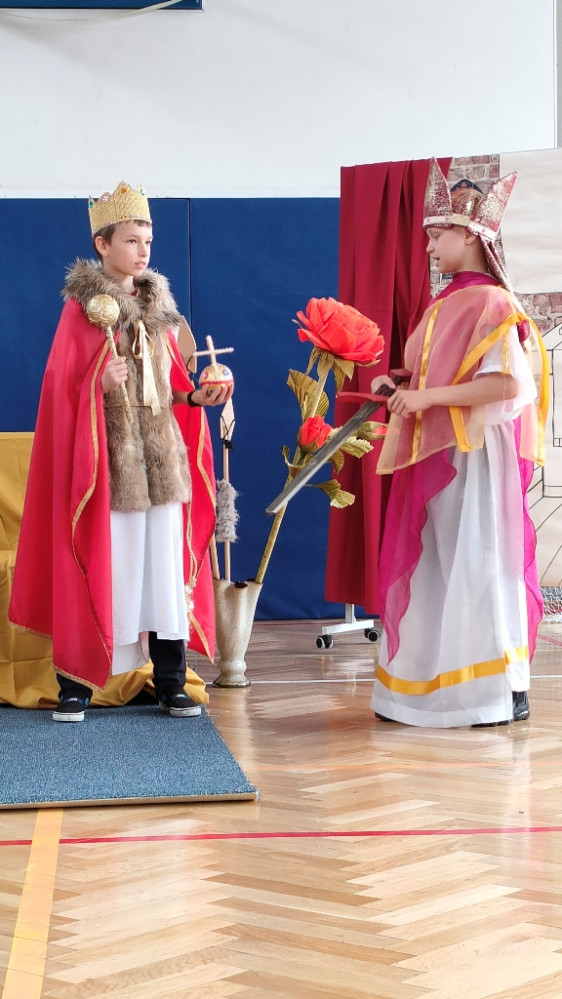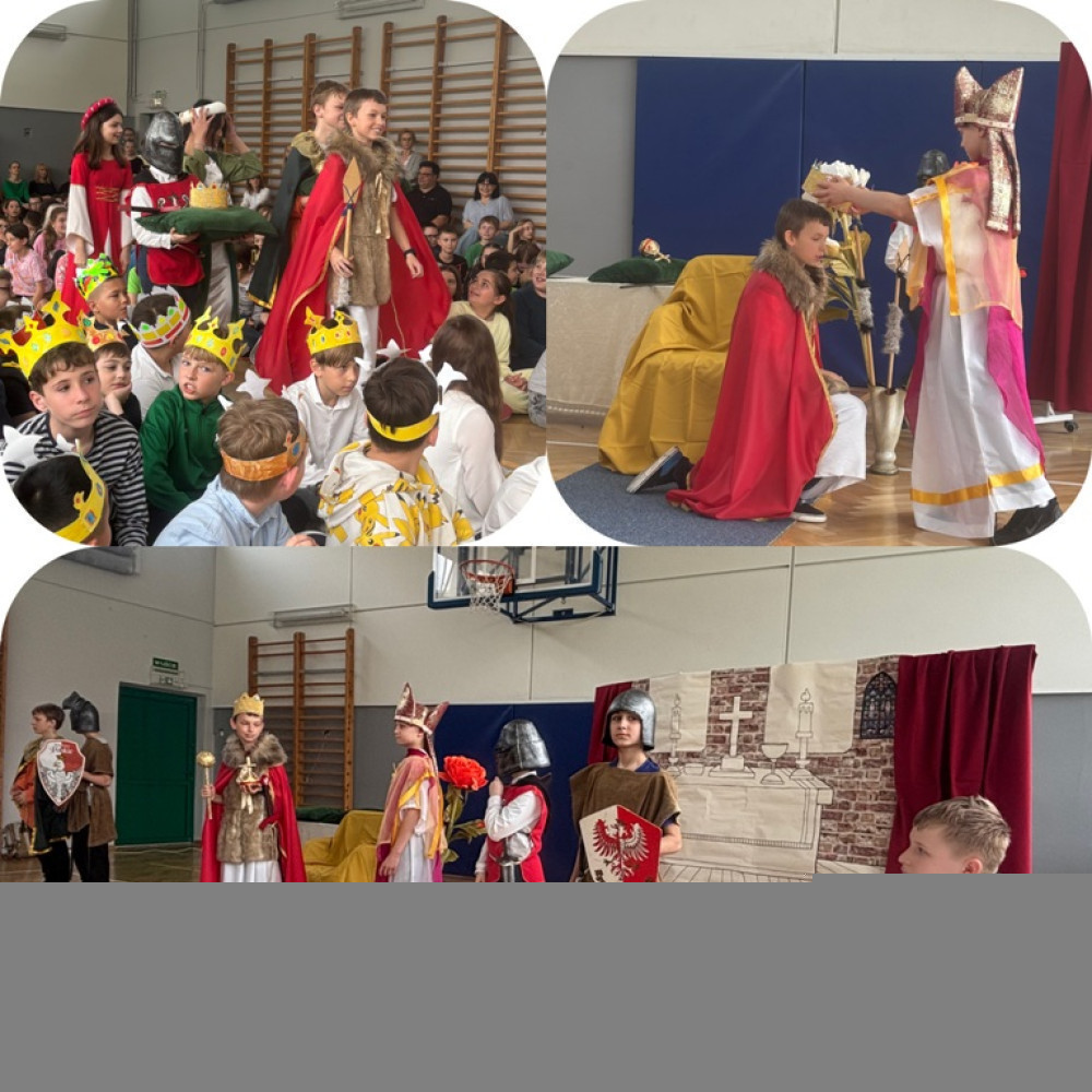 16 kwietnia 2025r. około południa zawitał w nasze skromne progi nietuzinkowy gość – sam król Bolesław Chrobry. Uczniowie klas II-VIII uczestniczyli w ceremonii koronacji syna Mieszka I przygotowanej przez klasę Vc. Stroje z epoki, podniosła muzyka, gra aktorska w mistrzowski sposób przeniosły nas w czasy pierwszego monarchy. Po inscenizacji mieliśmy okazję podziwiać występ Klubu Tańca Dawnego ,,Alta Novella”. Spotkanie na sali gimnastycznej stanowiło piękne podsumowanie naszych działań związanych z uczestnictwem w ogólnopolskim programie ,,1000-lecie Królestwa Polskiego” organizowanym przez Muzeum Historii Polski, Polskie Towarzystwo Historyczne oraz Instytut Historii i Archiwistyki UMK. W ogólnopolski projekt zaangażowało się wielu nauczycieli rozmaitych specjalności: działa poczta historyczna, odbywają się liczne konkursy, organizujemy projekty geograficzne, lingwistyczne, matematyczne... Tuż przed ceremonią projektowaliśmy na przykład koszulki dla Wielmożnego Króla, tworzyliśmy zdobne zaproszenia, memy, teksty piosenek i.... śmialiśmy się przy tym do rozpuku.