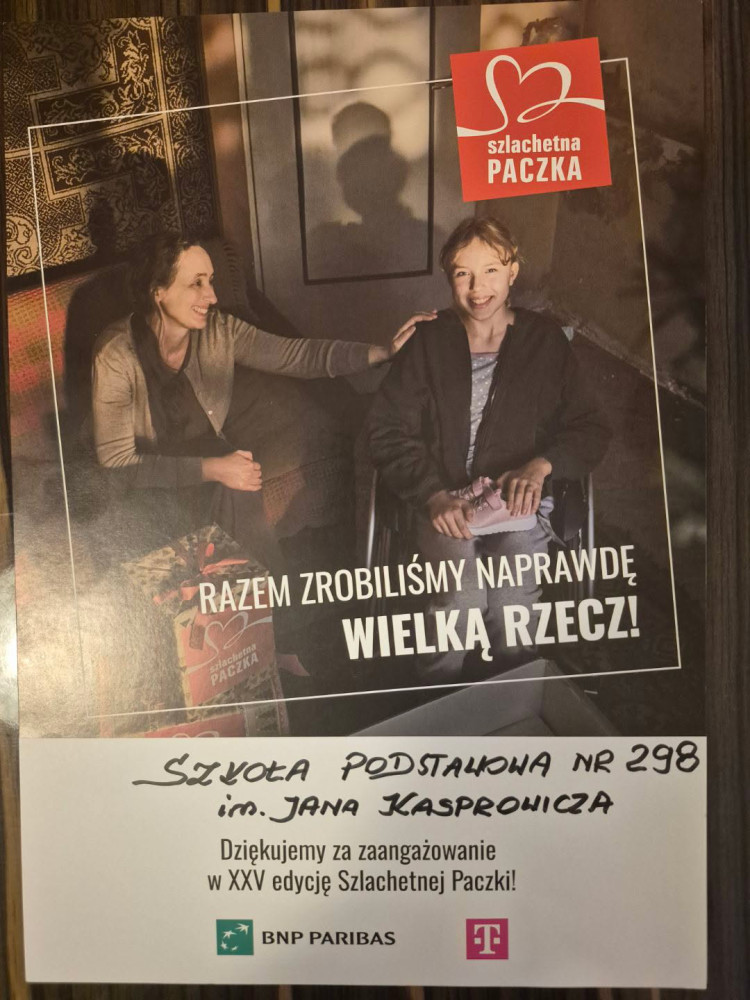 Nasza szkoła po raz kolejny włączyła się w ogólnopolską akcję Szlachetna Paczka. Dzięki ogromnemu zaangażowaniu uczniów, rodziców, nauczycieli oraz pracowników szkoły udało się zebrać wiele potrzebnych produktów, takich jak artykuły spożywcze, środki czystości, tekstylia oraz sprzęt gospodarstwa domowego. Wszystkie dary zostały starannie zapakowane i przekazane wolontariuszom Szlachetnej Paczki, skąd trafią bezpośrednio do rodziny potrzebującej wsparcia. Serdecznie dziękujemy wszystkim, którzy włączyli się w tę piękną inicjatywę. Okazane dobro, empatia i chęć niesienia pomocy pokazują, jak wielką siłę ma wspólne działanie.